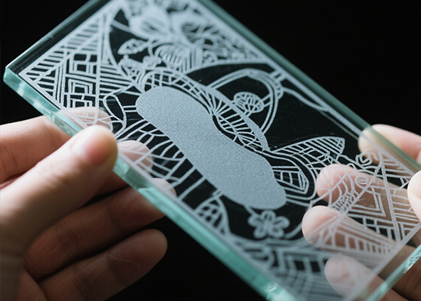 Un laser CO₂ este bine absorbit de suprafața de sticlă și este utilizat în mod obișnuit pentru gravarea suprafeței. Efectul de gravare al unui laser CO₂ apare ca un model alb, maciulat, făcându-l potrivit pentru publicitate, decorațiuni artistice și litere pentru cadouri. Laserele ultraviolete (UV), pe de altă parte, au o lungime de undă mai scurtă și funcționează într-un mod de „procesare la rece” cu o zonă minimă afectată de căldură. Laserele UV sunt capabile să producă linii fine, coduri QR și logo-uri.